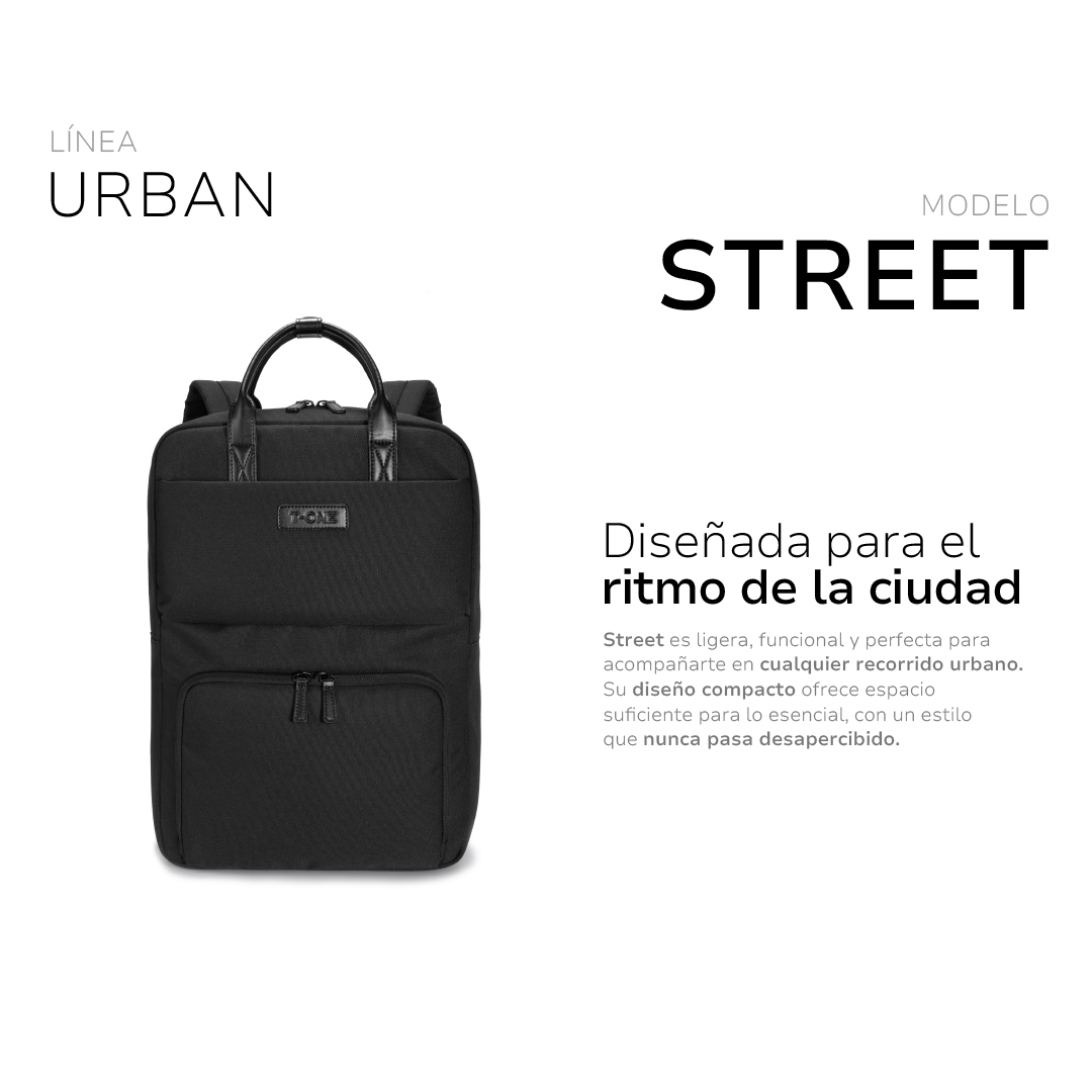 Street es ligera, funcional y perfecta para acompañarte en cualquier recorrido urbano. Su diseño compacto ofrece espacio suficiente para lo esencial, con un estilo que nunca pasa desapercibido.