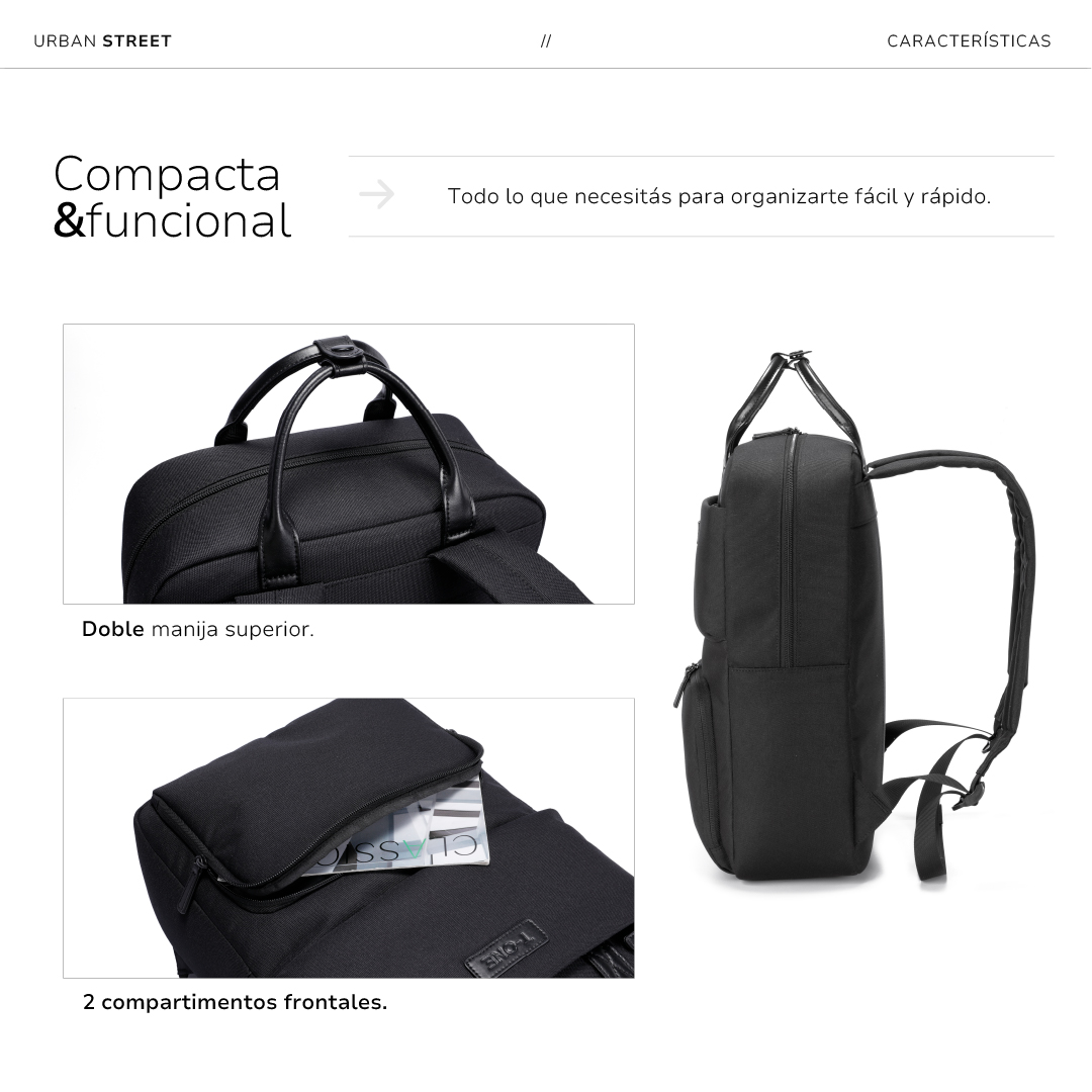 - Doble compartimento frontal : Espacios de fácil acceso para lo esencial.