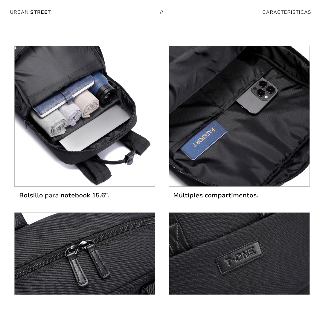 - Bolsillo interno para notebook 15.6” : Protección y comodidad para tu computadora.