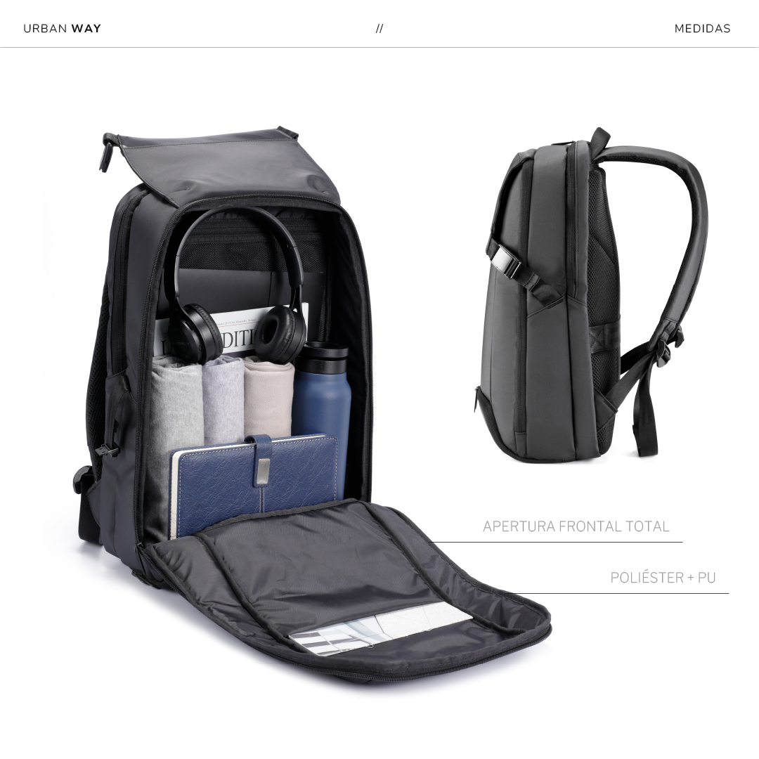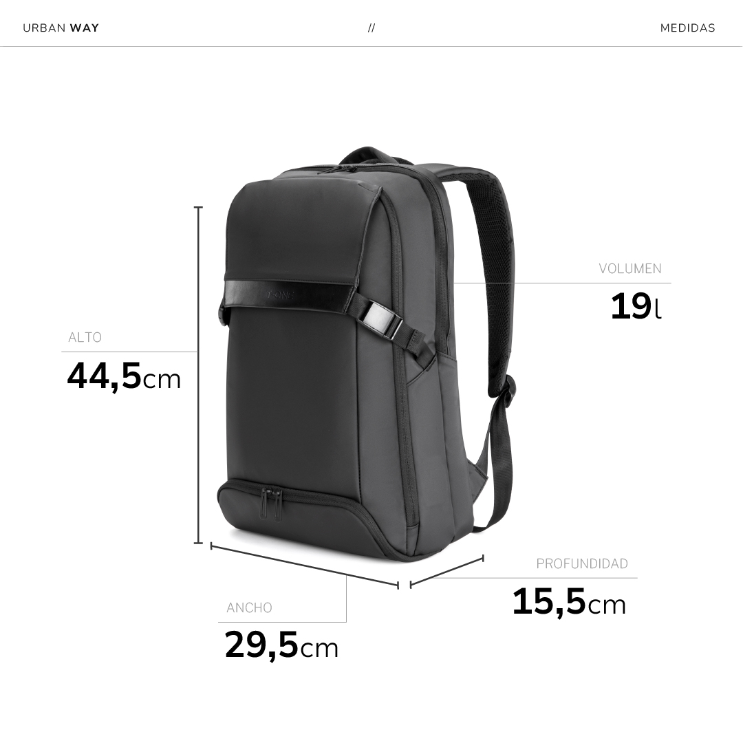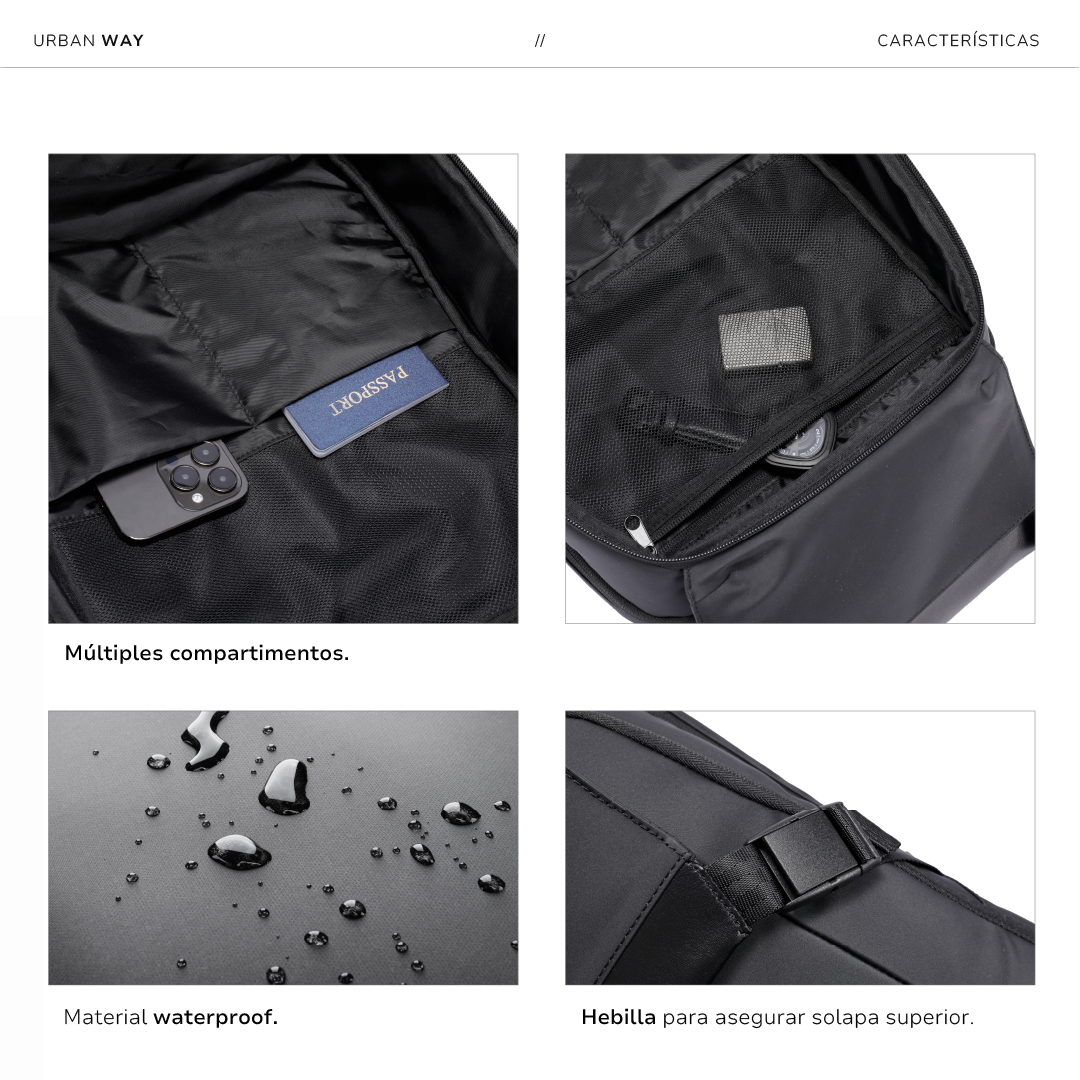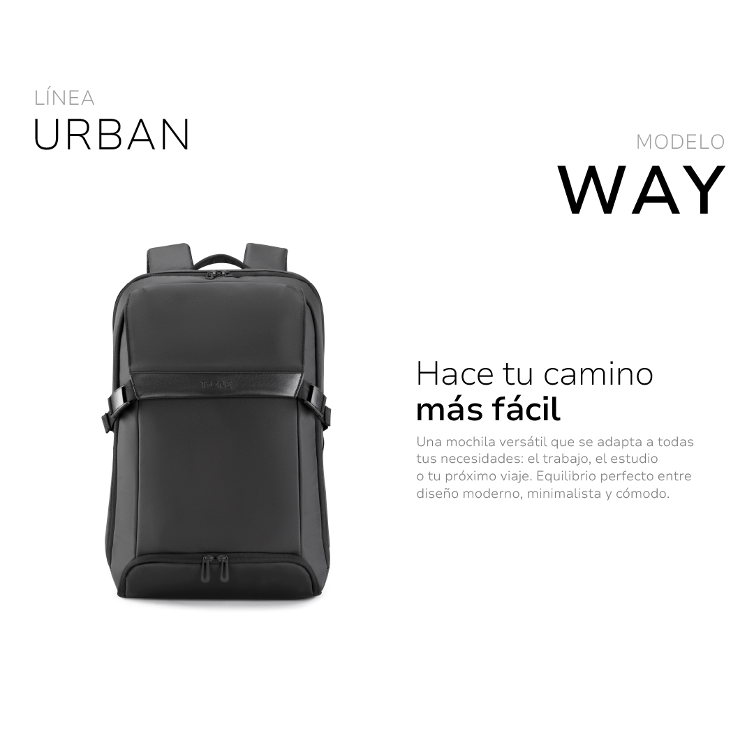 Con líneas limpias y un acabado premium, Way se distingue por su elegancia y funcionalidad. Su solapa de seguridad y compartimentos bien distribuidos ofrecen una solución práctica para organizar sus pertenencias con un estilo cómodo.