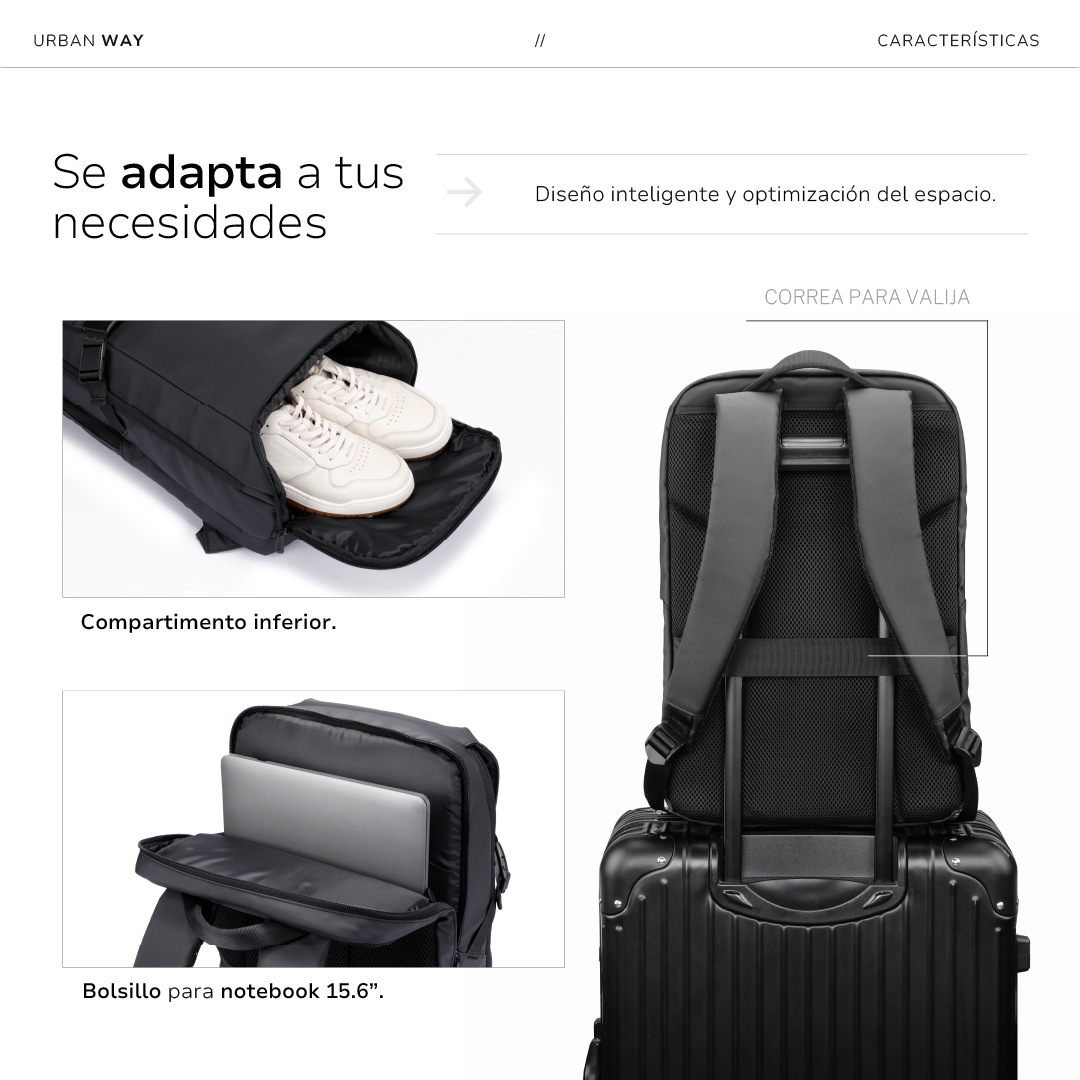 - Compartimento inferior tipo botinero : Perfecto para llevar un par de zapatillas u otros accesorios esenciales.
