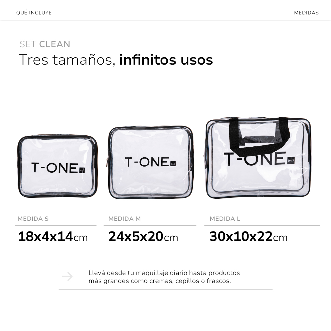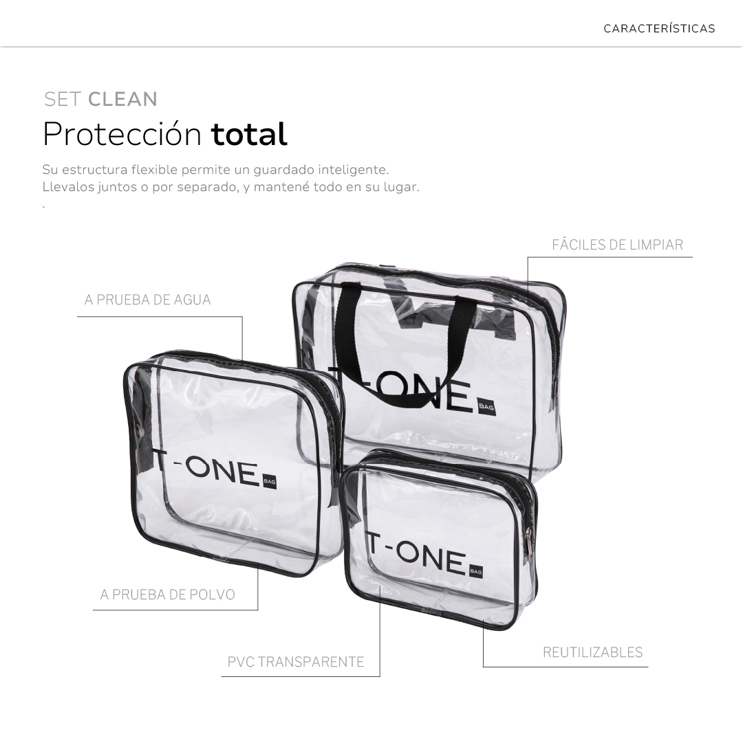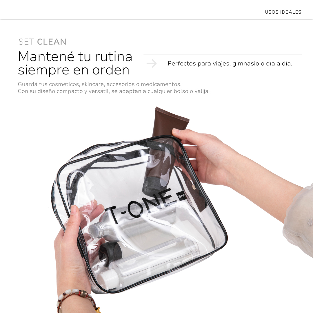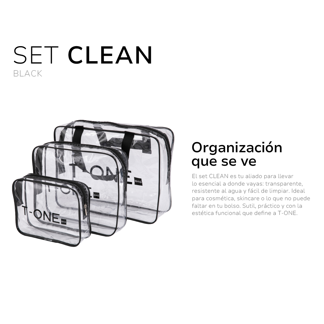El set CLEAN es tu aliado para llevar lo esencial a donde vayas: transparente, resistente al agua y fácil de limpiar.