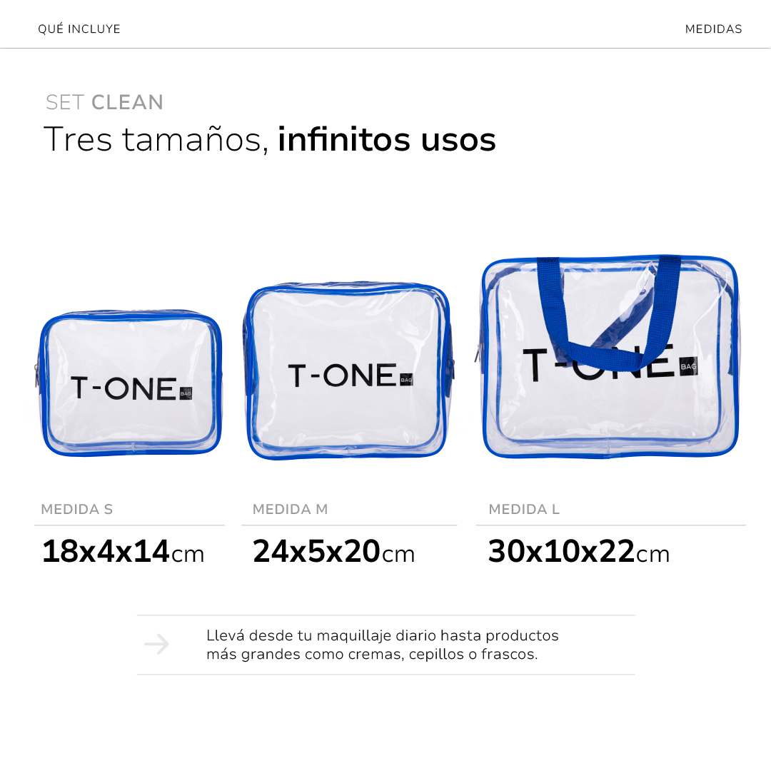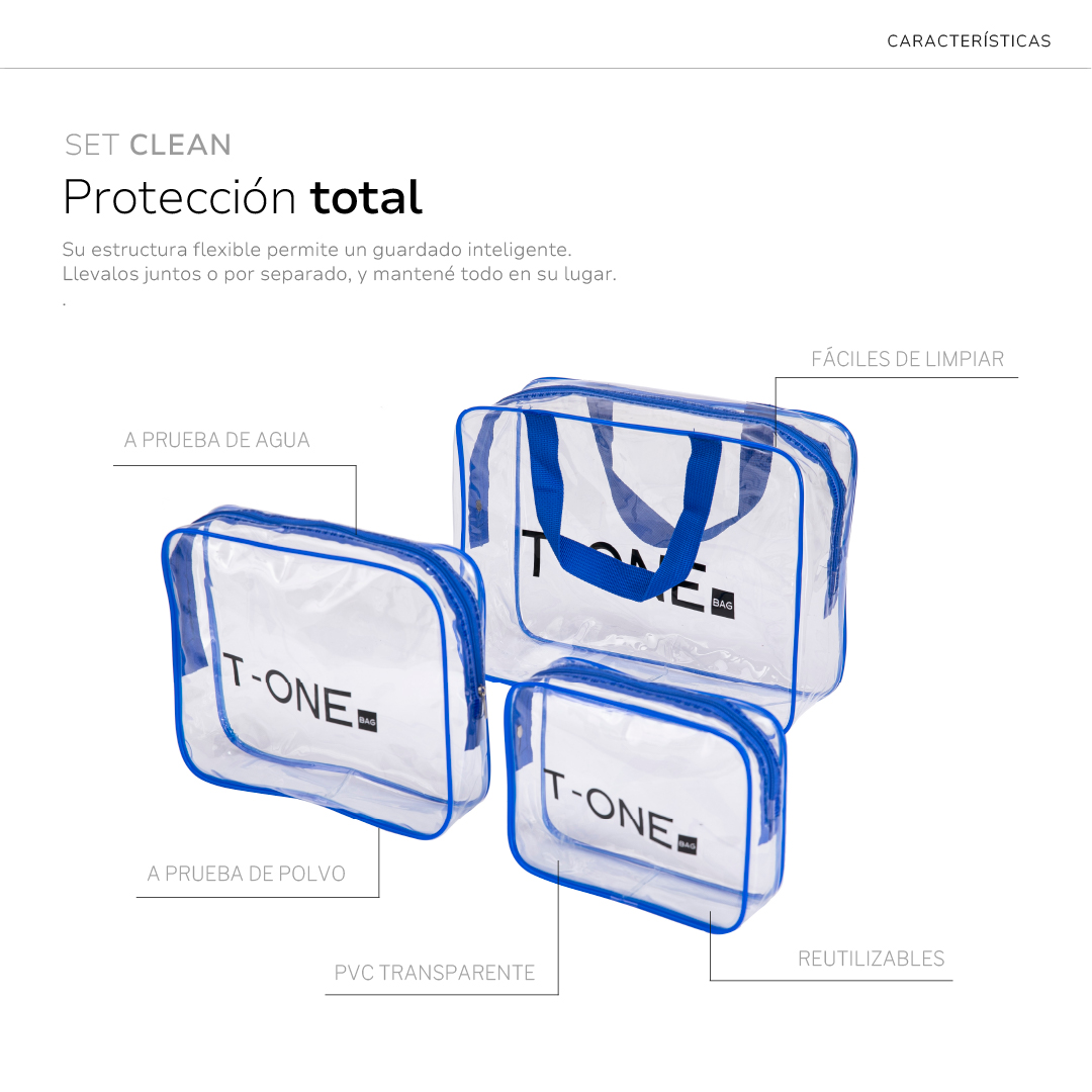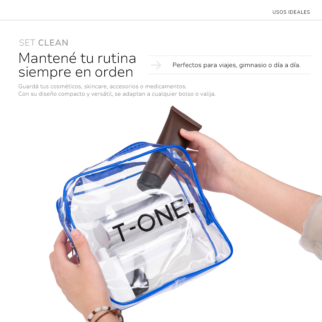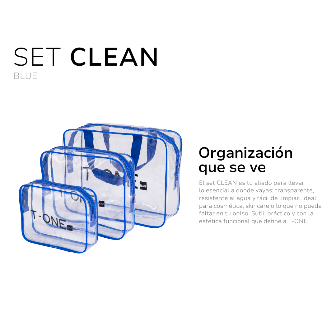 El set CLEAN es tu aliado para llevar lo esencial a donde vayas: transparente, resistente al agua y fácil de limpiar.