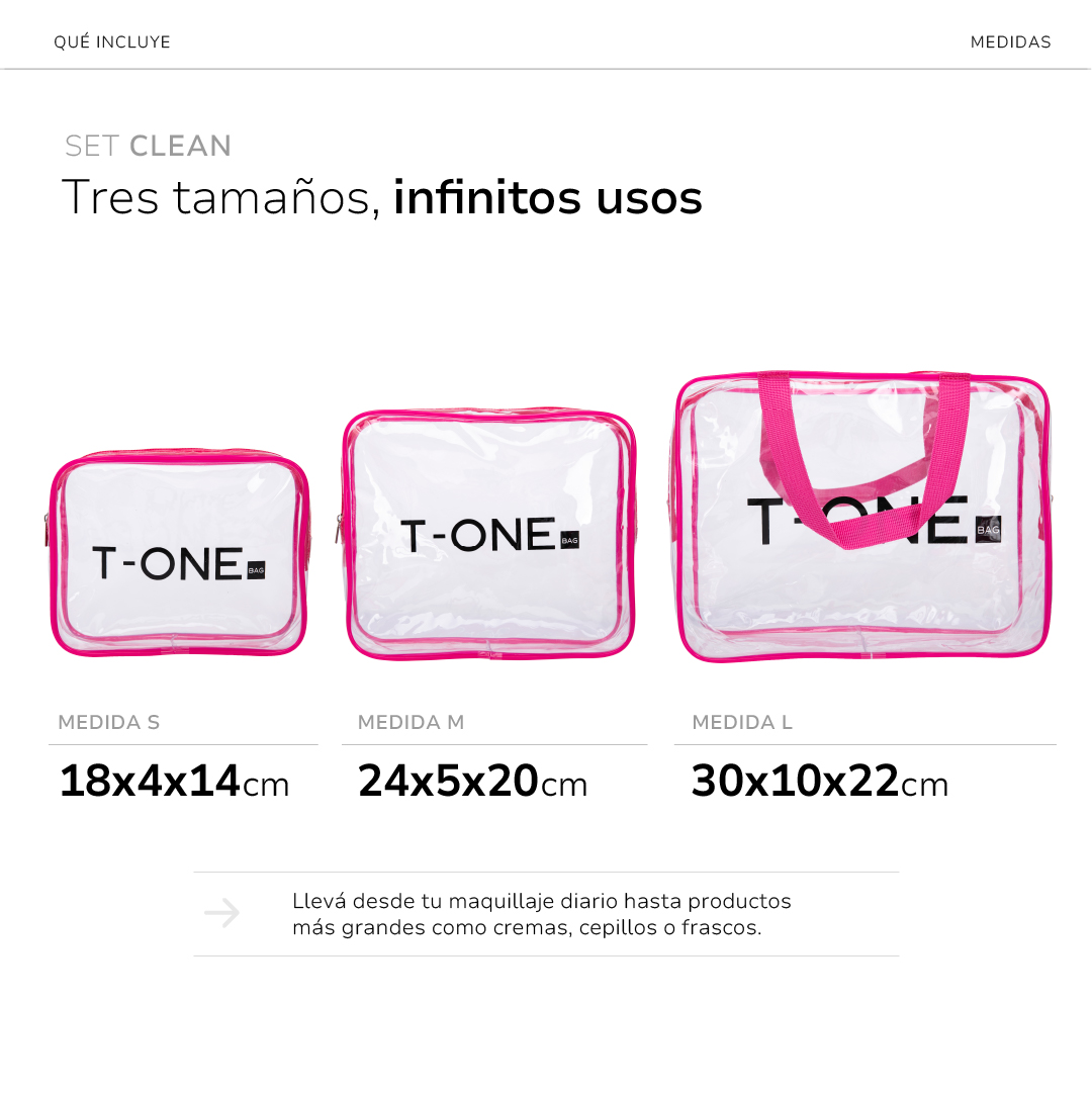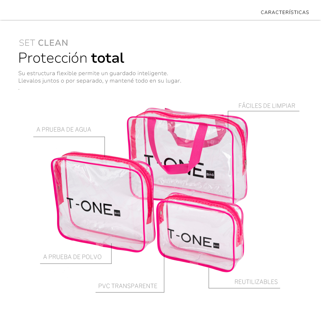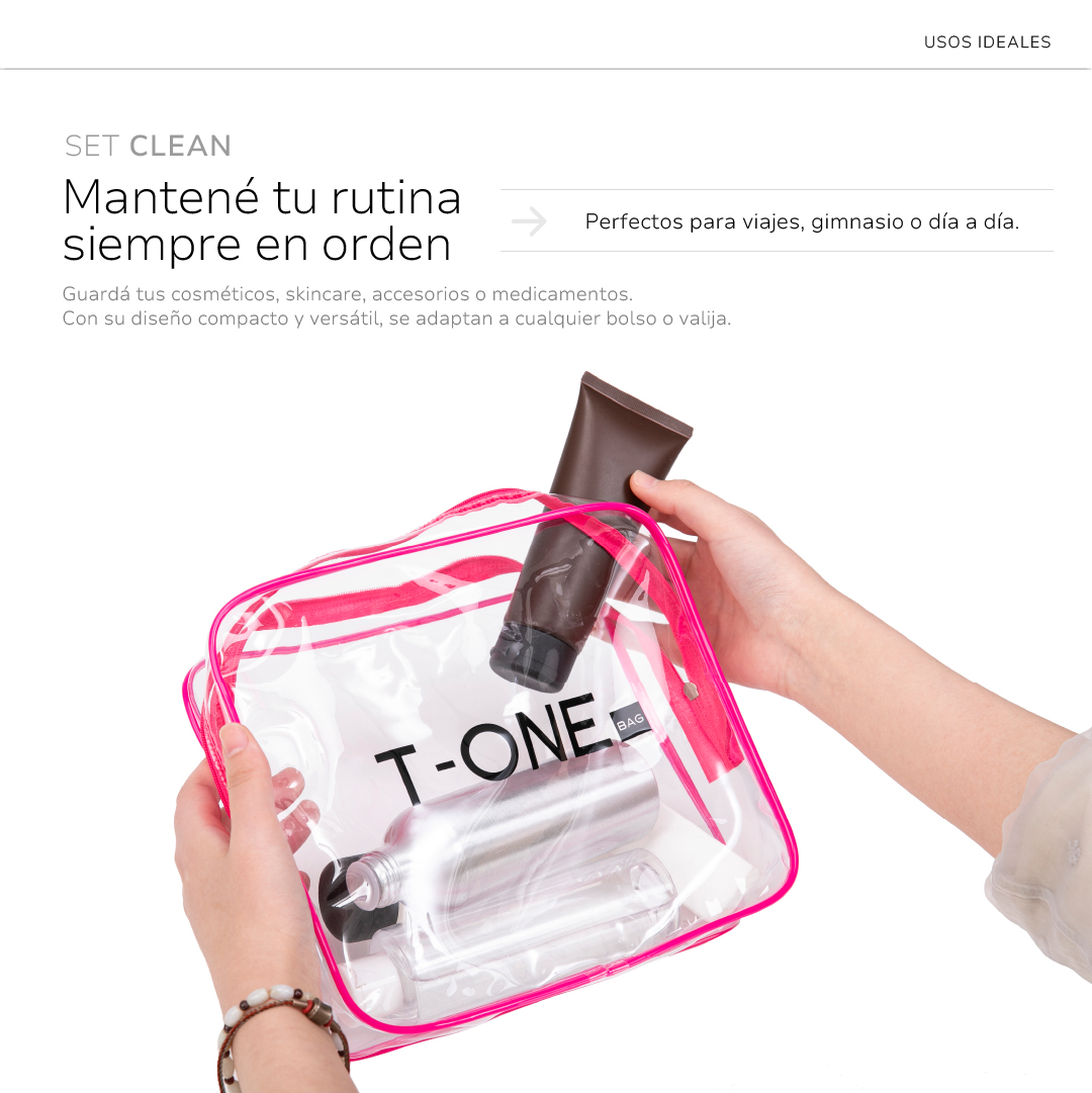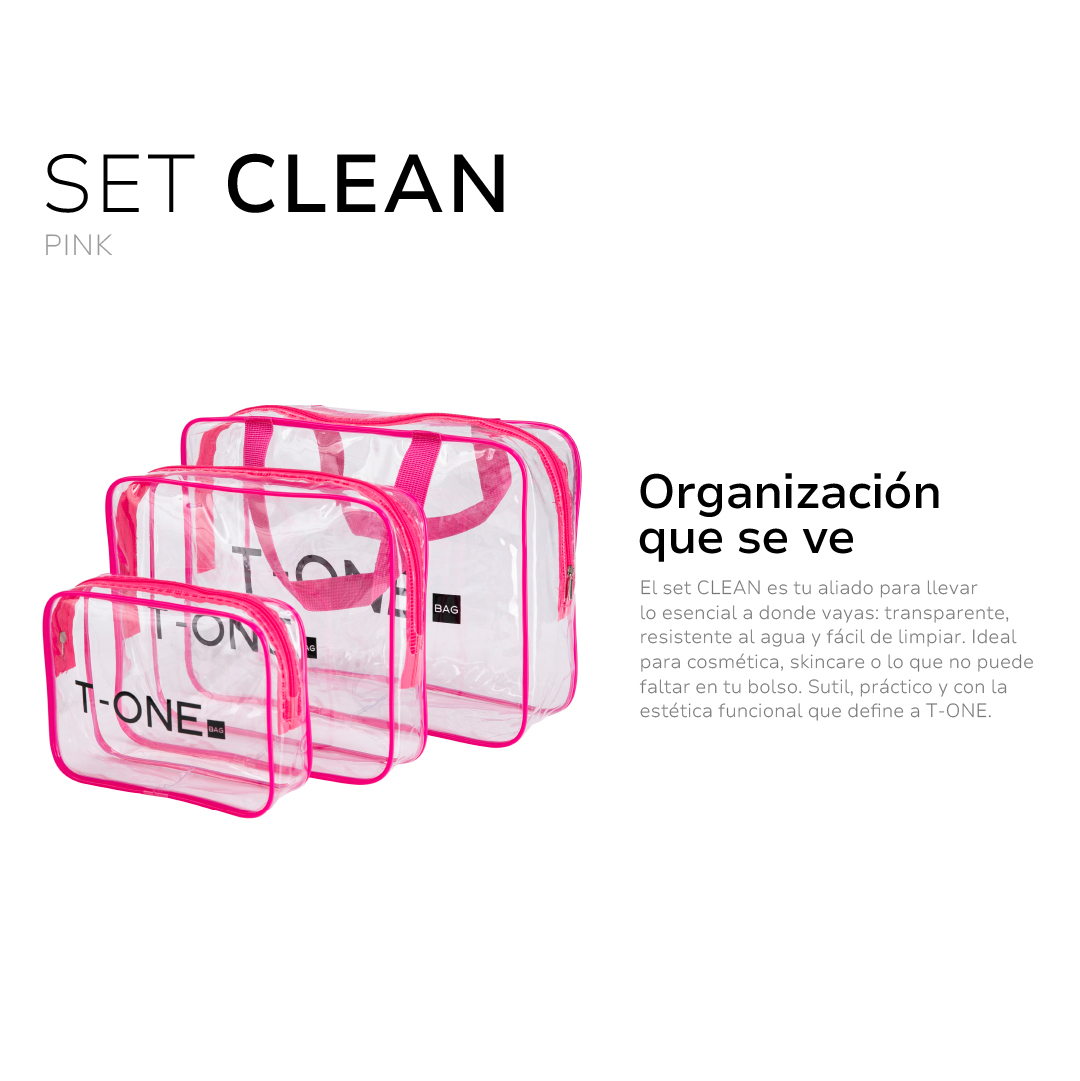 El set CLEAN es tu aliado para llevar lo esencial a donde vayas: transparente, resistente al agua y fácil de limpiar.