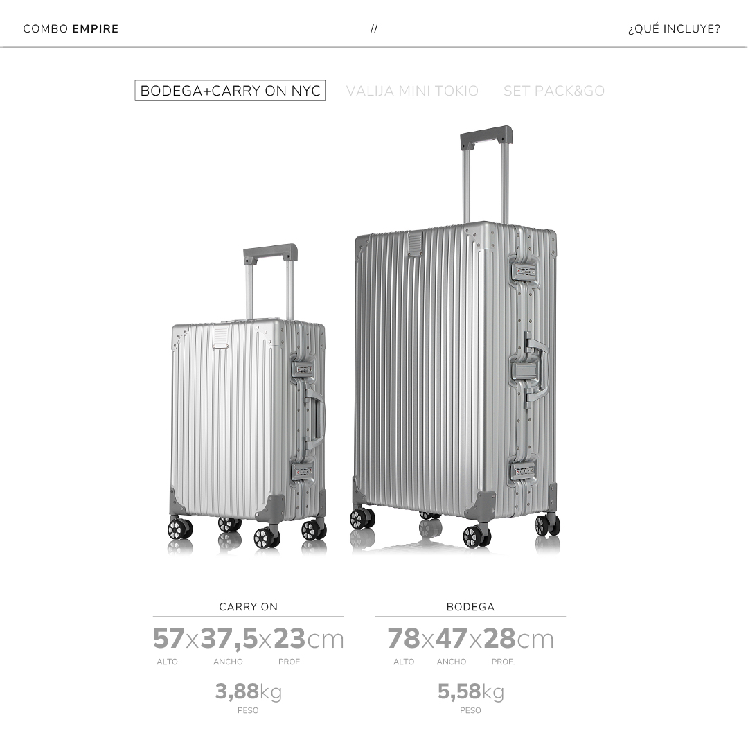 El Combo EMPIRE está pensado para quienes entienden que el equipaje no es un detalle, sino parte del viaje. Incluye la valija Bodega New York City de aluminio, la Carry On NYC y la compacta Mini Tokio —una trilogía de diseño y funcionalidad— más un set Pack&Go de regalo para organizar todo como un experto.
