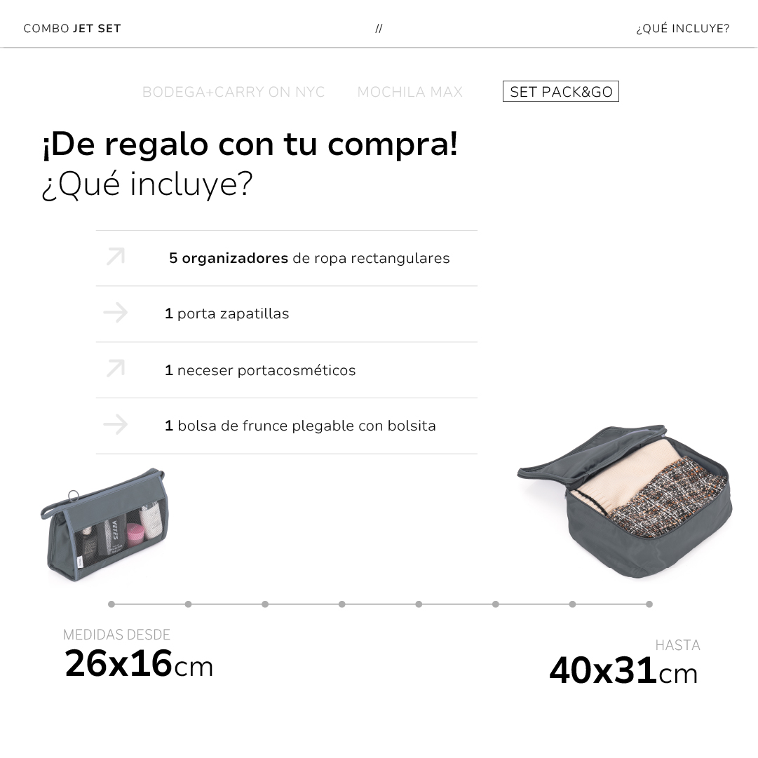- Set Pack&Go de regalo (organizador de ropa, portazapatillas, neceser y bolsa de frunce)