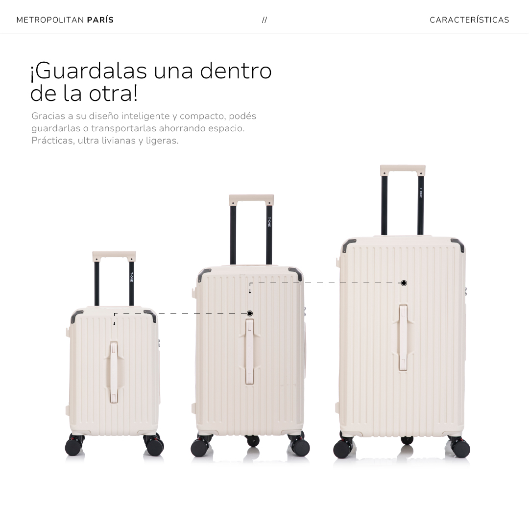 Las tres valijas pueden guardarse una dentro de la otra para optimizar espacio al guardar o transportar. Ideal para quienes valoran el orden y la practicidad.