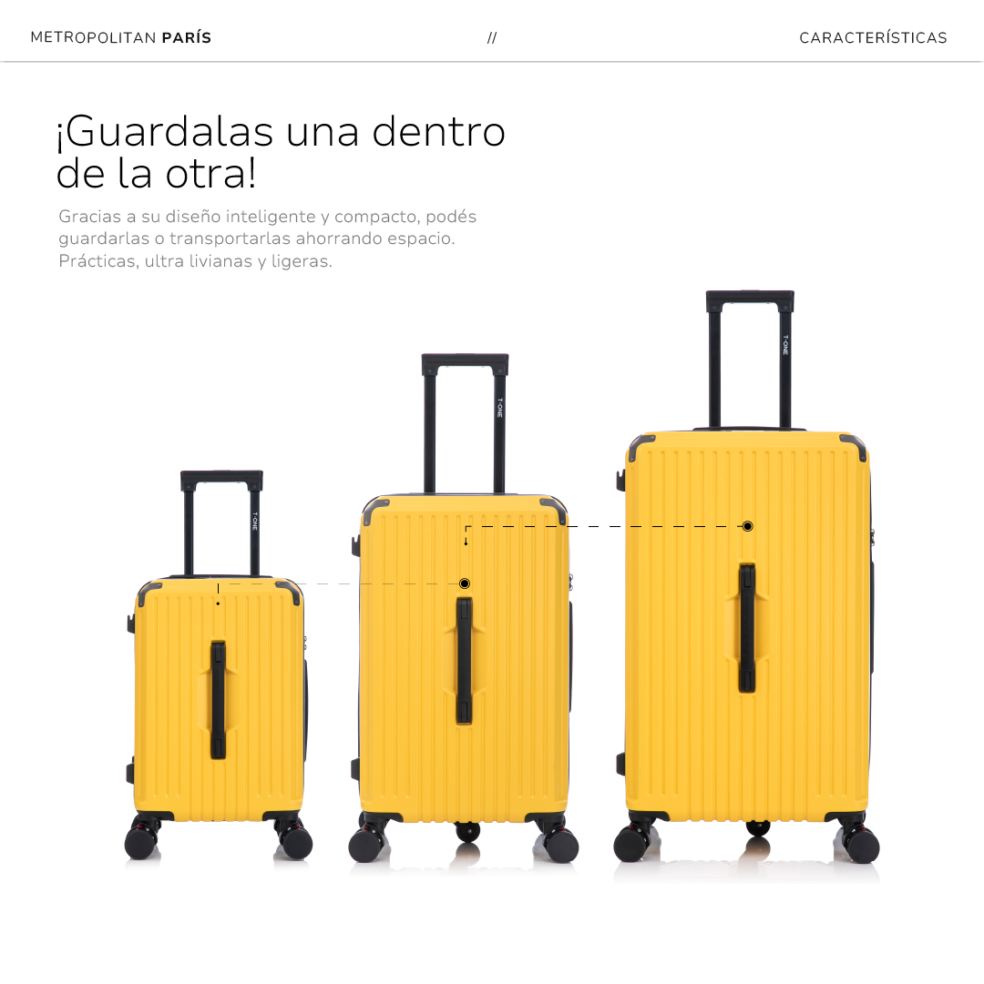 Las tres valijas pueden guardarse una dentro de la otra para optimizar espacio al guardar o transportar. Ideal para quienes valoran el orden y la practicidad.
