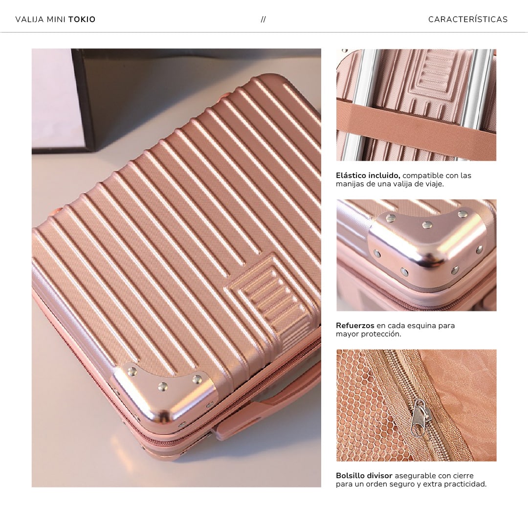 Llevá tu mini valija ajustada a la manija de tu carry on gracias a su elástico trasero y lucí un set que lo dice todo: elegancia, actitud y comodidad.