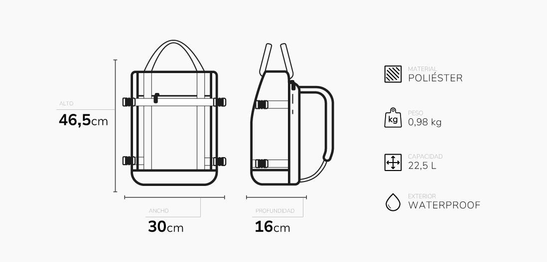 Inspirada en la arquitectura urbana y la movilidad actual, combina proporciones precisas, detalles técnicos y una estética sobria. Es la mochila para quienes trabajan, viajan y se reinventan cada día.